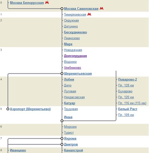 | Москва (Савёловский вокзал) — Икша | 6936 | 18:43 | 19:28 |